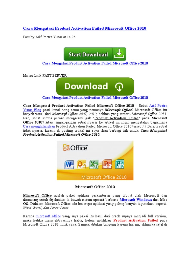 Microsoft office 2010 tidak bisa dipakai jika belum melakukan aktivasi setelah proses jangan lupa aktifkan kembali antivirus di komputer/laptop kamu. Ini perlu dilakukan untuk menghilangkan pemberitahuan microsoft office unlicensedâ atau office product key not valid berikut tampilan apabila anda masih menggunakan microsoft office 2010â unlicensedâ. Notifikasi product activation failed ini pasti akan muncul setiap membuka microsoft office apapun, baik itu microsoft word, excel, power point, dan sebagainya.