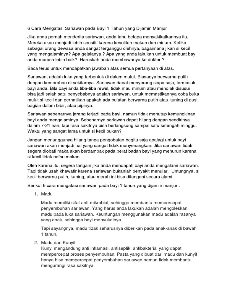Timbulnya sariawan akan membuat bayi menjadi rewel dan susah makan. Timbulnya sariawan akan membuat bayi menjadi rewel dan susah makan. Sariawan merupakan proses peradangan pada permukaan mukosa, baik pada mulut, bibir, maupun vagina. Mengatasi sariawan pada bayi sebenarnya tidak terlalu membutuhkan perawatan khusus.